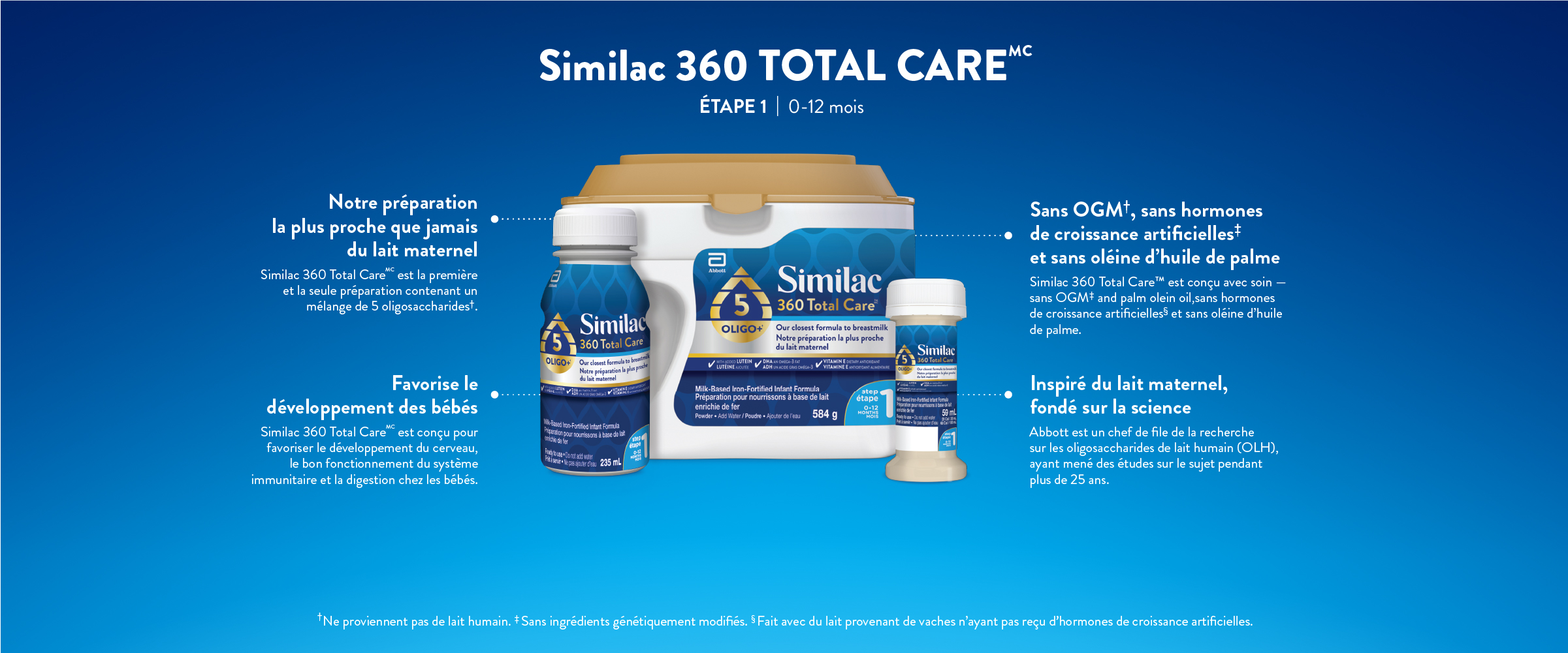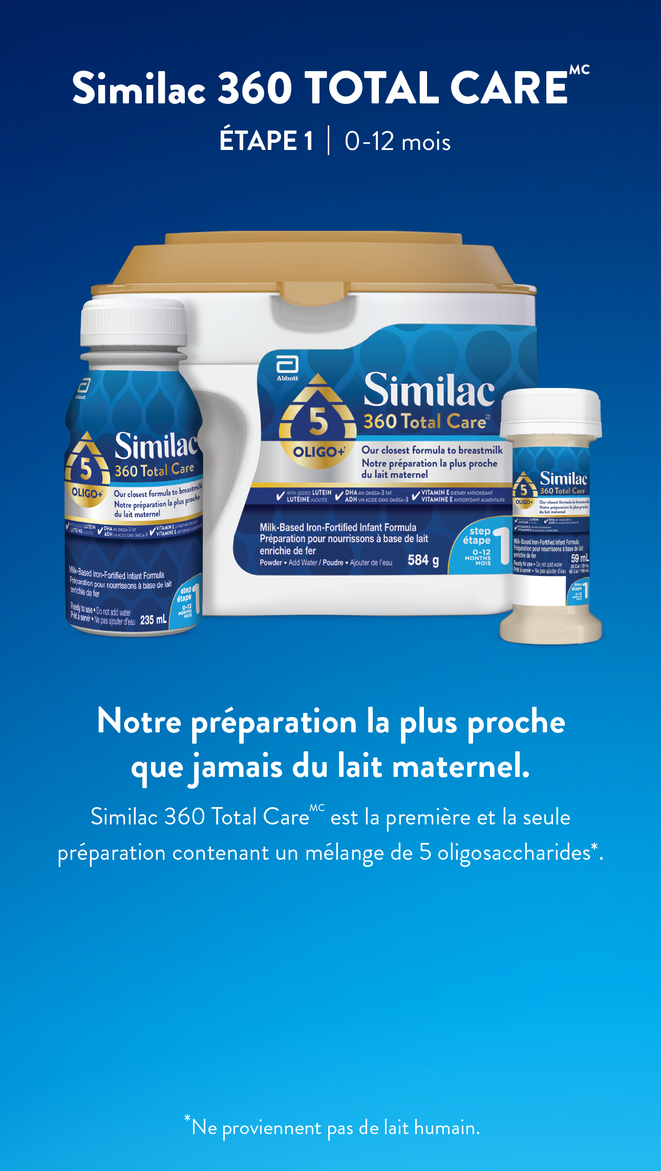 Similac 360 Total CareMC est notre préparation pour nourrissons la plus avancée, conçue pour procurer une alimentation complète* à votre bébé, pendant ses premières années de vie. Il s’agit de la première et de la seule préparation contenant un mélange de 5 oligosaccharides†, qui représentent 5 des oligosaccharides les plus abondants dans le lait maternel. Similac 360 Total CareMC est conçu pour favoriser le développement du cerveau, le bon fonctionnement du système immunitaire et la digestion chez les bébés.
